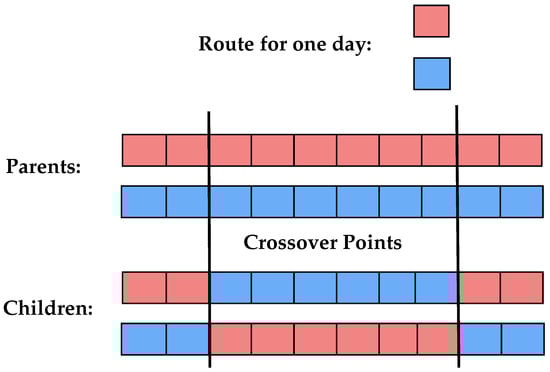 The individuals are initialized by scheduling clients based on their visit frequencies for in-person visits per year, depending on their category. Clients are assigned to available days within their allowed time slots, prioritizing empty days to promote even distribution and reduce schedule imbalance. This strategy helps respect time windows and sets a strong foundation for feasible solutions. Once clients are assigned, each day’s route is finalized by adding the depot (0) at the start and end. This process is repeated to generate the full population for the first generation.