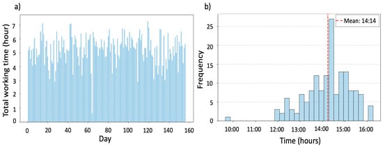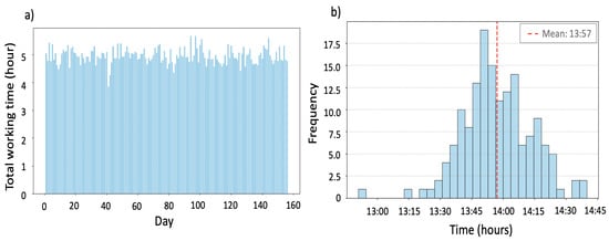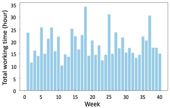 Figure 14 shows the total working time per week for the long-distance salesperson. The running time of the model was . The best trade-off solution resulted in a total travel time of 29,204 (40.6 hpm), with a variance in weekly work duration of 179,980.43 min2. The results indicate some variability in weekly workloads, with most days falling between 10 and 26 h, though a few weeks reach even higher, peaking at over 34 h. These fluctuations may reflect the uneven geographic distribution of clients in some clusters, which exists. Some clients in a cluster are very far away from the others. Despite the variability, the results show that the 40 h working weekly limit is respected. The solution also satisfies all the other requirements.