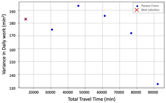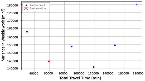 The Pareto front shown in Figure 15 illustrates the trade-off between total travel time and the variance in weekly working time for the long-distance salesperson. The best solution, marked in red, reflects a compromise between the two conflicting objectives, achieving relatively low total travel time while maintaining a moderate level of variance since it is the solution with the smallest Euclidean distance to (0,0). This balance suggests that the model successfully identified a practical route plan that avoids excessive fluctuation in weekly workload without incurring prohibitively high travel costs, aligning well with real-world considerations for long-distance planning. The calculated spread () for the long-distance Pareto front is approximately 0.0655, indicating a well-distributed set of solutions along the front.
