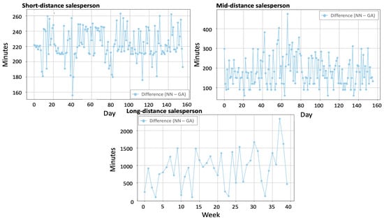 We summarize the total travel time results obtained from the NN and GA approaches for each type of salesperson in Table 2. As shown, the GA model consistently outperforms the NN approach in all scenarios. The corresponding percentage reductions further illustrate the efficiency gains of the GA method. The Figure 16 illustrates the daily and weekly travel time differences between the NN and GA models for the three salespeople, highlighting the efficiency improvements with the GA model.