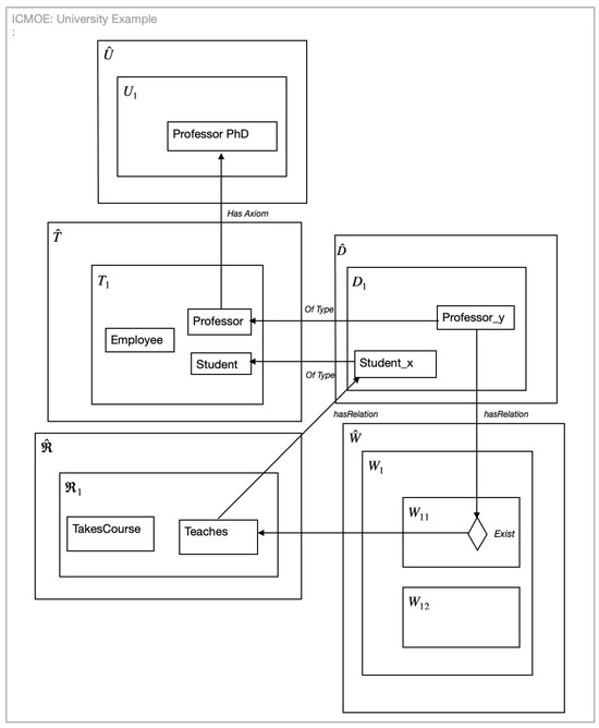 To clarify the elements and structure of ICMOE, consider a real-world example of a university that provides learning services to the community. In this case, university represents the domain of interest in a specific state, denoted by , where .
