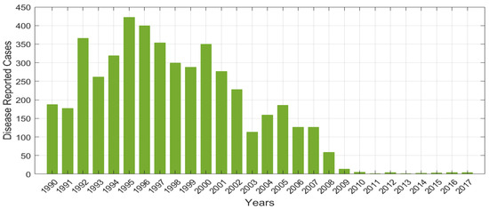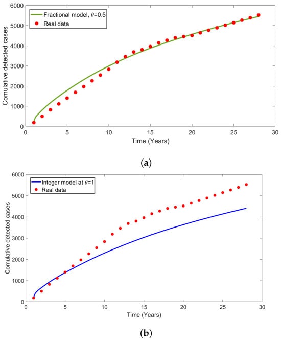 Numerical simulations, conducted using Euler and Adams–Bashforth–Moulton schemes, our findings. The model was fitted to 28 years of HAT case data from Tanzania (Figure 2), showing that the fractional-order model () outperforms the integer-order model () in capturing reported cases. This highlights the importance of memory effects in modeling chronic diseases like HAT. Simulations varying the fractional order () demonstrate that lower values improve the memory effects, leading to faster convergence to disease-free or endemic equilibria when or , respectively (Figure 11 and Figure 12). The impact of control strategies is significant. Insecticide use at reduces below unity, substantially decreasing new infections (Figure 13 and Figure 14). Prevention measures, such as protective clothing, at , similarly curb transmission (Figure 15 and Figure 16). Combining these measures improves efficacy, with contour plots suggesting that 30% insecticide coverage and robust prevention can eliminate HAT. Health education campaigns, while reducing susceptibility by 97% and exposure by 88% at 78% implementation (Figure 17), are insufficient alone to drive , necessitating integrated approaches.