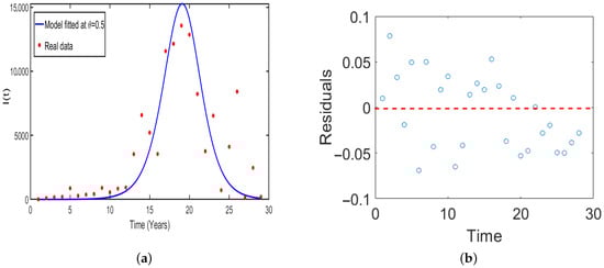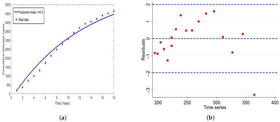Plot of (a) Model fit to the reported cases of HAT in Uganda (b) time series against residuals.