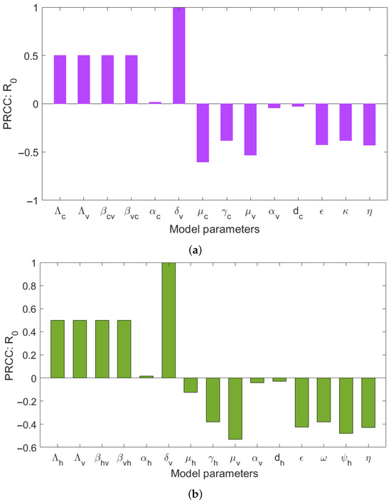 Sensitivity analysis of (a) to the model parameters that influence the disease transmission between cattle and tsetse flies, (b) to the model parameters that influence the disease transmission between human and tsetse flies.
