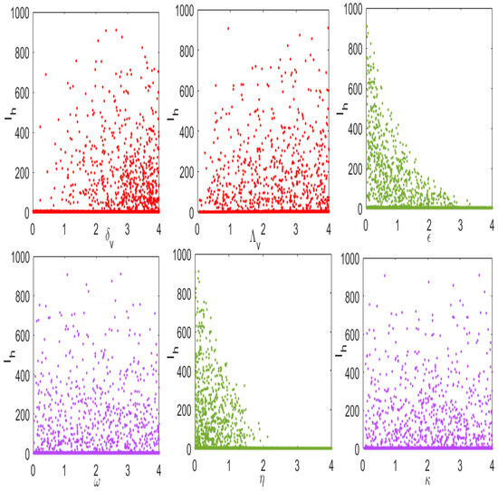 Numerical simulations in Figure 9 shows the Latin Hypercube sampling of to model parameter that have high influence on HAT transmission. Overall, the result reveals that model parameters such as insecticides , prevention measures and tsetse mortality rates have negative correlation with . The results imply to eliminate HAT disease in population, policymakers, and other stakeholder need to allocate enough resources on insecticides and prevention mechanism.