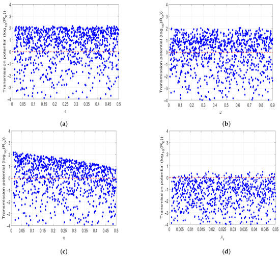Numerical simulations in (Figure 9) show the Latin Hypercube sampling of in relation to parameters that has high influence on the disease transmission. Overall, our results demonstrated that model parameters such as rate of the use of insecticides , prevention measures , and the tsetse deaths have negative correlation with . The results imply to reduce the spread of HAT in community, policy makers and other stakeholders must allocate enough resources for the use of insecticides and prevention measures.