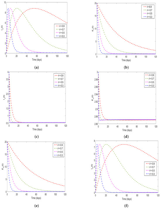 Numerical results of model (4) at with order of derivatives set to (a) describing the solution behavior of infected cattle, (b) describing the solution behavior of exposed cattle, (c) describing the solution behavior of infected tsetse flies, (d) describing the solution behavior of exposed tsetse flies, (e) describing the solution behavior of exposed humans, (f) describing the solution behavior of infected humans.