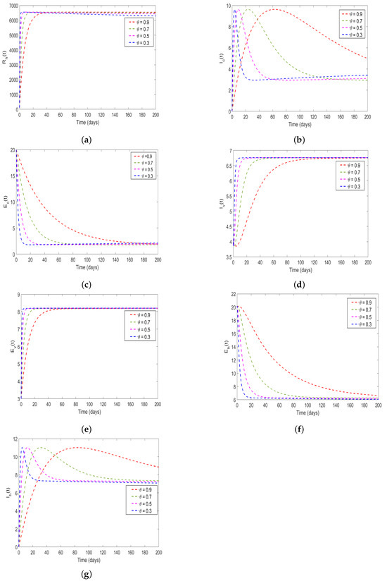 In this study, the effect memory (order of derivatives) on HAT transmission is investigated, and we perform the numerical simulation of system (4) for both and and the results is presented in (Figure 11 and Figure 12). For the simulation purposes, memory effects are selected between 0 and 1 and was set to be: (), as mentioned in the literature that when the order of derivatives the fractional-order model based on Caputo derivative becomes a classical ordinary differential model. From the numerical simulations, the results showed that as is close to 0, the memory effects of biological species increase, and numerical results decrease and converges to disease equilibrium, specifically, when the numerical results converges to unique point after 20 days. In contrast, when , the numerical results converges to endemic equilibrium. Additionally, the numerical results demonstrated that as order of derivatives close to 0, the model results converge to equilibrium points earlier than when close to unit.