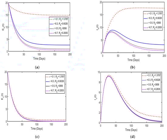 Model simulation in (4) shows the impact of prevention on HAT transmission: (a) from exposed cattle to susceptible tsetse flies, (b) from infected cattle to susceptible tsetse flies, (c) from exposed humans to susceptible tsetse flies, (d) from infected humans to susceptible tsetse flies.