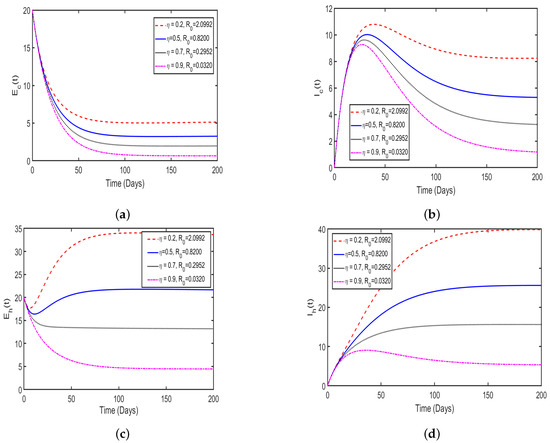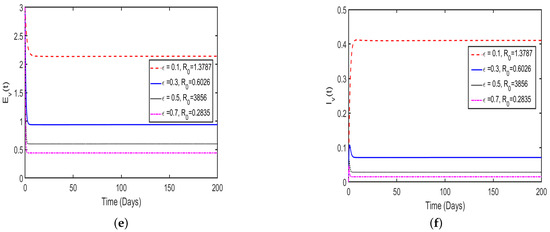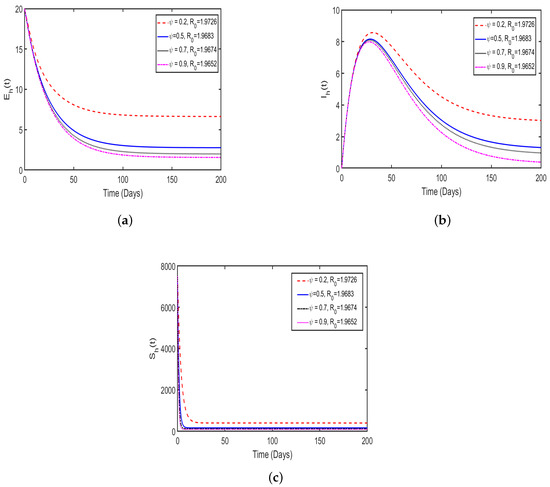 Figure 17 shows that the increase in health education about spread of HAT among human population by leads to the decline in the rate of susceptibility of human beings by . Consequently, this leads to the decline in the rate of exposure to the disease by throughout the entire simulation period.