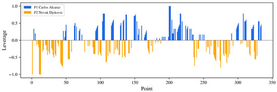 For visualization purposes, we assign the two players’ leverage to the opposite sign (positive versus negative). The leverage gained by each player can be shown in Figure 3. The blue and orange bars are the leverage of Alcaraz and Djokovic, respectively, and Lt = 0 is the turning point.