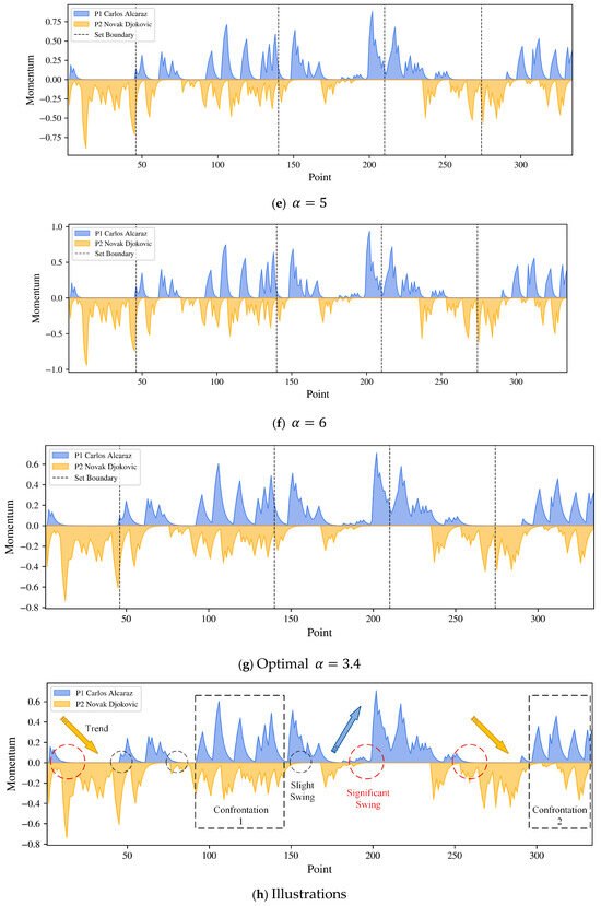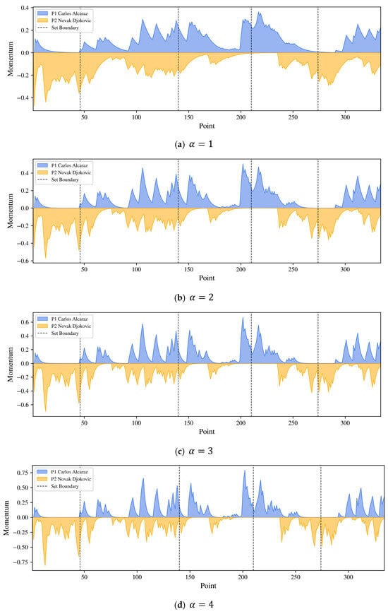 As shown in Figure 4, we start with . When we increase the magnitude of , the momentum graph tends to display more subtle details and level changes of a match. On the other hand, we may not be able to capture the main trend of the match if is too large. For visualization purposes, we utilize after all the calculations. The blue area stands for Alcaraz’s momentum, and the orange area stands for Djokovic’s momentum. When the player’s momentum is approximately zero but not zero, he is still not in the total downdraft. On the other hand, a momentum swing is more likely to occur when one player demonstrates positive momentum while the other’s momentum approaches zero. In that case, the player has less pressure from his rival and has more chance to win or swing the match.