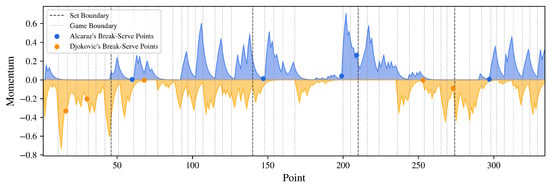 We find that the break-serve point affects the momentum significantly, as shown in Figure 5. The blue points stand for Alcaraz’s break points, and the orange points stand for Djokovic’s. The sets and game boundaries are all marked in the plot. It is obvious that when a player wins the break-serve point, he is more likely to have a rapid increase in his momentum, especially for Alcaraz. As a result, break-serve points play an important role in players’ wins in the next few points.