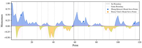 This section presents the results of applying our momentum quantification methodology to the Wimbledon 2023 final (Carlos Alcaraz vs. Novak Djokovic, 3:2) and the Paris 2024 Olympics women’s singles match (Zheng Qinwen vs. Donna Vekić, 2:0).