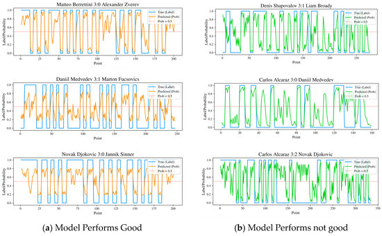 To be more specific, as Figure 13 suggested, if the performance of two players has significant differences, their momentum will reflect their future performance. However, the performance of our model will drop when PR happens. Most of the time, by the end of the game, the model can correct its earlier incorrect predictions. Our model becomes more accurate as the game goes on.
