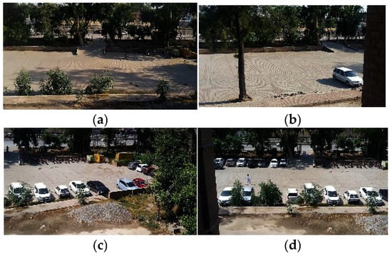 Two datasets were used in the experimental method: one was for parking, and the other was for license plates. The parking dataset was manually created for the parking area at Islamia College Peshawar. A total of 11 full-size images were collected. It also included eight images of sunny conditions, with three images in rainy weather. Each image had dimensions of 1920 × 1080. Figure 1 shows different scenes from the parking yards based on sunny conditions. The slot areas were cropped from each image, with a total of 212 slot images in sunny conditions and 59 slot images in rainy conditions; a combination of both constituted a total of 272 slot images, which included both empty and occupied spaces. As a result, the dataset was imbalanced, with a low ratio of slot images. To address this, we applied two techniques—histogram equalization and augmentation, the rationale for which is discussed in the following section. Table 1 shows the total number of images in each class. An additional dataset consisting of 300 license plate images was downloaded from the internet.