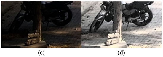 An image was converted from RGB to YUV format before being processed with the histogram equalization algorithm. Although YUV is a color space, it is similar to the RGB color space model. A single YUV channel requires a traditional histogram equalization method for processing, which was already introduced in [52,53]. After completing the procedures, the slot image is converted into RGB format from the YUV color space. To maintain consistency throughout the dataset, we used a traditional histogram on all images of the parking dataset before submitting them to the model. Figure 2 shows the result of the histogram technique when applied to the cropped images. Figure 3 shows the result of the histogram equalization technique applied to the cropped images. Sub-images ‘a’ and ‘c’ represent the original images affected by poor lighting, while sub-images ‘b’ and ‘d’ show the enhanced images after applying histogram equalization.