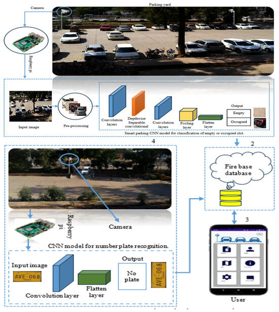 This section outlines the methodology used to implement the proposed system. Figure 1 illustrates the strategies proposed for the method. Cameras were set at various angles in the parking lot and were connected to a Raspberry Pi. Each camera captured images, which were then processed by Raspberry Pi devices running a CNN model installed for classification. The predicted label was stored in cloud storage. To use the parking service, the commuters registered with the proposed mobile application and then requested a parking space. At the entrance gate, a license plate recognition system managed computer vehicles. Whenever a commuter arrived at the gate, if their license plate was recognized and if a space was available, access was granted; otherwise, it was denied.