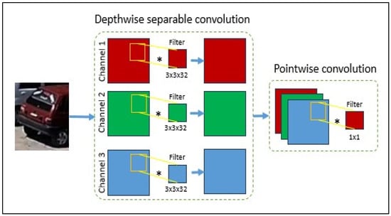 Depth-wise separable convolution operation, image splits into three channel and applied 3 × 3 filter on individual channel then combined output applying 1 × 1 filter.