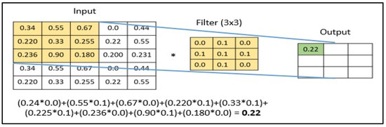 The proposed CNN model architecture is shallow in terms of the number of layers, as shown in Figure 5. Unlike other CNN models such as VGG16, ResNet50, MobileNet, and Xception, it uses simple architecture. The feature extraction phase includes two convolutional layers, one depth-wise separable convolutional layer, and a max-pooling layer. One convolution occurs at the first layer, and another at the third layer, after the depth-wise separable convolution. Convolution is a matrix multiplication operation where the kernel values are multiplied with corresponding values; the result of this operation is illustrated in Figure 6. The depth-wise layer separates the image into three channels, such as red, green, and blue. Each channel is then multiplied with a filter. After this process, the three channels are recombined, and point convolution is applied. A 1 × 1 filter operates on the output of depth-wise convolution. Figure 7 shows the depth-wise separable convolution operation. All feature layers use the same configuration, with a kernel size of 3 × 3 and 32 filters. Figure 8 shows that max pooling plays a significant role in deep learning by reducing the dimensionality of features as it is applied to the feature maps. In the fully connected part of the model, there is only one dense layer with 64 neurons, followed by a sigmoid function for class probability output.