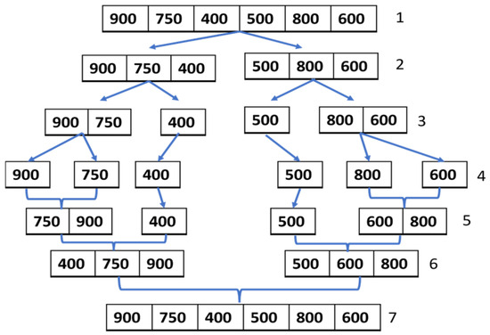 Several heterogeneous algorithms have been developed to solve the problem. An algorithm is a finite sequence of steps designed to solve a specific problem. Researchers have widely applied various algorithms to find solutions; for example, Dijkstra’s algorithm, genetic algorithms, and K-Nearest Neighbors (K-NN) have been used to estimate the shortest distance. In computer science, algorithms are applied across diverse problem areas such as network communication, shortest path computation, and road navigation, depending on the nature of the problem. This experiment employed the merge sort algorithm. Although several sorting algorithms are available, the merge sort was chosen due to its efficient worst-case time complexity of O (n log n) [109,110], which makes it suitable for searching through records. Merge sorts follow a divide-and-conquer approach. In the first phase, it recursively divides the list into halves until each sub-list contains a single element. In the second phase, it merges these sub-lists by comparing elements, eventually producing a fully sorted list [111]. As described, merge sort techniques are used in the proposed method behind the mobile application. During this time, the distance list that was obtained was unsorted. The list is processed using the merge sort algorithm, which outputs a sorted list upon completion. In this sorted list, the first index represents the nearest parking location, with each subsequent index indicating a progressively greater distance. The final index corresponds to the farthest parking spot. Figure 9 illustrates the concept of the merge sort algorithm.