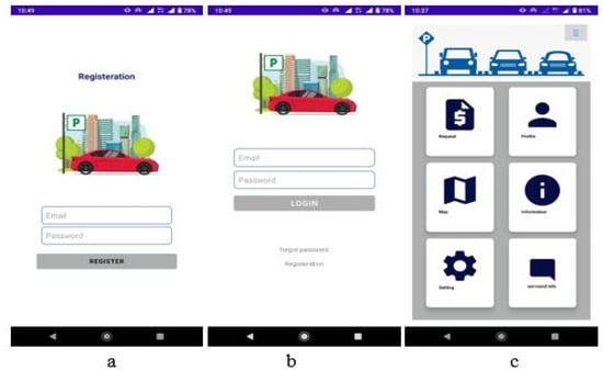 Shows the mobile application pages: ‘(a)’ is the registration page, ‘(b)’ is the login page, and ‘(c)’ is the menu page.