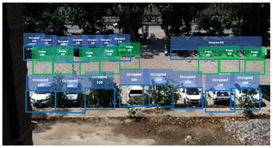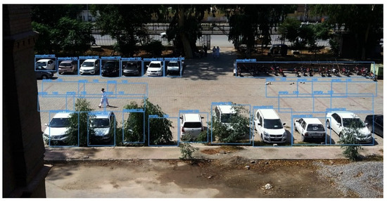 In recent years, computer vision-based smart parking systems have garnered substantial attention, driven by advancements in deep learning and the growing need for scalable, real-time solutions deployable on edge devices. These systems leverage camera feeds and deep neural networks to monitor and manage parking areas efficiently, often reducing the need for costly ground sensors [7]. For instance, a deep learning solution based on the VGGNet group was implemented to detect parking space occupancy, demonstrating the effectiveness of convolutional models in structured parking scenarios. In [8], a hybrid approach utilizing Faster R-CNN and YOLOv3 enabled the real-time detection of available slots, significantly improving urban traffic flow by notifying drivers about free parking spaces through a smart interface. Similarly, ref. [9] proposed an advanced real-time parking management framework tailored for congested urban environments, combining YOLO-v4 object detection with behavioral data analysis. This integration allowed for the dynamic allocation of parking spaces based on user preferences and historical patterns, achieving 82% precision and reducing parking search times by 20%.