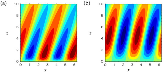 Figure 1a illustrates the solution (20) in a rectangular region defined by nondimensional variables and . For illustration and comparison, we set the same choice of parameters used for some of the numerical simulations presented in [29]: , , , , , , . These values correspond to a region of approximate width and depth with reasonable values of the dimensional quantities, , and [29]. This gives linear gravity waves with horizontal wavelengths of up to (with ), representative of small-scale waves in the lower atmosphere [34,35].