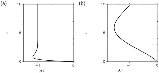 Figure 2a,b show graphs of the momentum flux expression (53) as a function of z for the two configurations that were represented in Figure 1 with and . In each case, the value of has been scaled by dividing the expression (53) by the value of the constant first term in the expression. In Figure 2a, the depth of the heating layer is less than the density scale height and the waves generate a nonzero momentum flux divergence in the region above the peak of the heating profile; this decays to zero with altitude. In Figure 2b, there is a layer of deep heating, with depth greater than the density scale height, and there is a nonzero momentum flux divergence over the entire domain. In both cases, the momentum flux decreases with altitude from zero to negative values in the lower part of the domain; this means there is a negative drag force, which would result in a negative wave-induced mean flow component at that level. These conclusions support the results of nonlinear time-dependent numerical solutions [29] that show variations in the mean momentum flux and heat flux with altitude above the thermal forcing region that, over time, lead to a wave-induced mean flow.