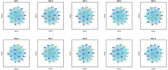 Force-directed layout visualization of the regions of interest (ROIs) based on their correlation patterns (10 ROIs, each one with 20 nodes). Nodes represent ROIs, and edges represent the correlations between them. The layout is determined by balancing attractive and repulsive forces between nodes, resulting in a spatial arrangement that highlights clusters of highly correlated ROIs.