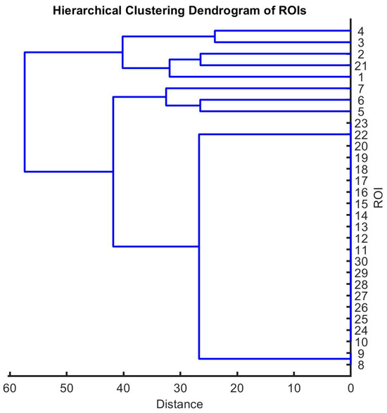 We applied hierarchical clustering to the adjacency matrix to group nodes based on their similarity. We plotted the dendrogram to visualize the hierarchical structure of communities (see Figure 5). The dendrogram illustrates the hierarchical clustering of regions of interest (ROIs) based on the similarity of their correlation matrices. Each leaf node in the dendrogram represents a single ROI, and the height of the nodes reflects the distance (e.g., 1—correlation) between them. The choice of linkage method (e.g., average, complete, or ward linkage) was guided by preliminary comparisons, with the average linkage providing a balanced view of cluster relationships consistent with the network topology.