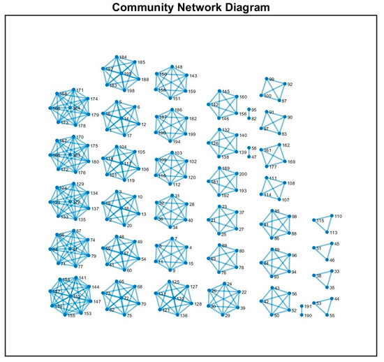 We plot the adjacency matrix where rows and columns are reordered based on community assignment. This can highlight dense blocks along the diagonal, indicating strong intra-community connections (see Figure 4). The community structure derived from the Louvain algorithm was further validated by comparing modularity scores and stability across multiple runs, ensuring that the detected communities are not artifacts of stochasticity.