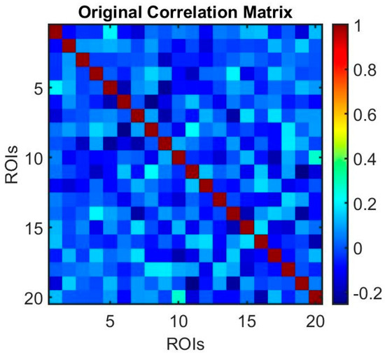 The correlation matrix (before sliding window analysis) represents the functional connectivity patterns. Each cell in the heatmap represents the correlation coefficient between two regions of interest (ROIs).