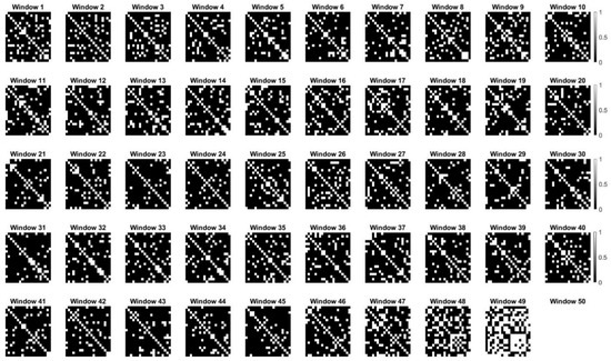 Dynamic changes in correlation matrices representing brain network connectivity over time (without an optimal window size). Each subplot illustrates the binary correlation matrix for a sliding window of time, with brightness indicating the strength of correlation between regions of interest (ROIs). This analysis reveals the dynamic nature of brain network connectivity and the importance of understanding fluctuating functional interactions within the brain.