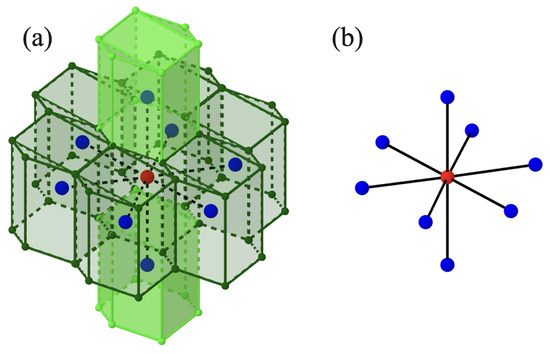 (a) An hexagonal prism cellular automaton and their six first nearest neighbors in the same plane and two additional neighbors just above and below the cell under review. (b) The graph that represents the relation between the hexagonal prisms.