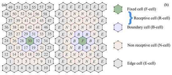 (a) The horizontal flat surface tessellated with hexagons and enumerated. (b) The cellular automata are shown in their different states, which are deployed around a nucleator. The fixed tiles that form the bone matrix are marked with an (F), the border tiles with a (B), then the non-receptive tiles (N) and the edge tiles (E).