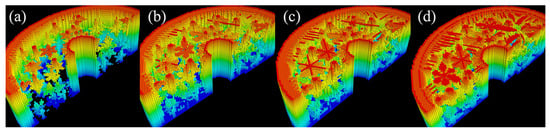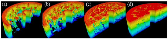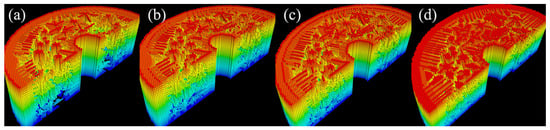 Initially, one or more cells are designated as nucleators, with their state set to . These nucleators can be positioned at predefined locations, within a single layer, across multiple planes, or at randomly determined coordinates. All other remaining cells initially take on a value of .