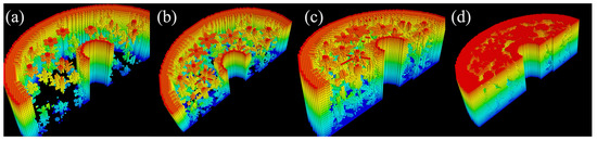 The morphology of the bone mineral matrix, while entirely deterministic for a given set of , and values, exhibits considerable richness in form. Any alteration to these parameters yields a distinct structure, indicating a strong dependence on initial conditions or, more broadly, a chaotic behavior. For visualization purposes, only half of the data points were plotted to reveal the resulting internal structures, and the chosen color scheme serves solely to highlight the changes within the mineral matrix.