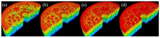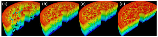 Bone section with parameters and after 500 stages (a), then after 1000 stages (b), changing the parameters to and with 1500 steps (c), finally with parameters for 2000 stages (d).