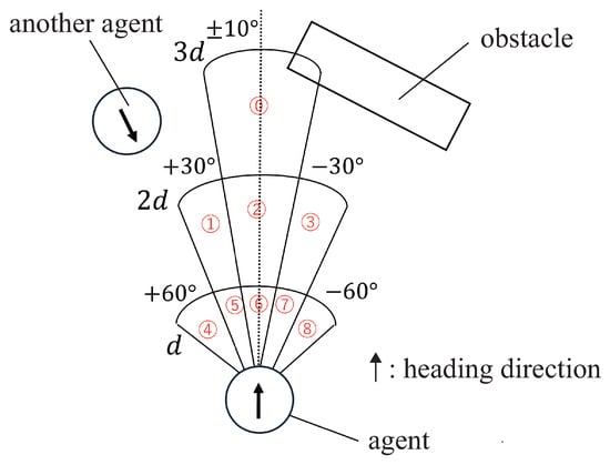 The action set available to each agent is designed to balance simplicity, navigational realism, and learning efficiency. At every time step, the agent selects one of seven possible actions: move forward, turn ±10° or ±60° relative to its current heading, stop, or move directly toward the goal direction if the goal is visible. Each action corresponds to a transition to an adjacent cell in a discretized grid environment. The resulting movement is subject to environmental constraints: agents cannot move into cells occupied by obstacles or other agents. If the selected move is invalid, the agent remains in place and incurs a penalty, as defined by the reward structure described in Section 3.1.