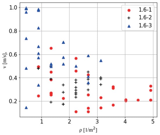 Liu [10] report a similar trend, particularly beyond 3.0 persons/m2, where velocity drops significantly. Our results exhibit comparable behavior under different inflow conditions (labeled as 1.6-1, 1.6-2, and 1.6-3), with the transition from free to congested flow clearly emerging near 2.0 persons/m2.