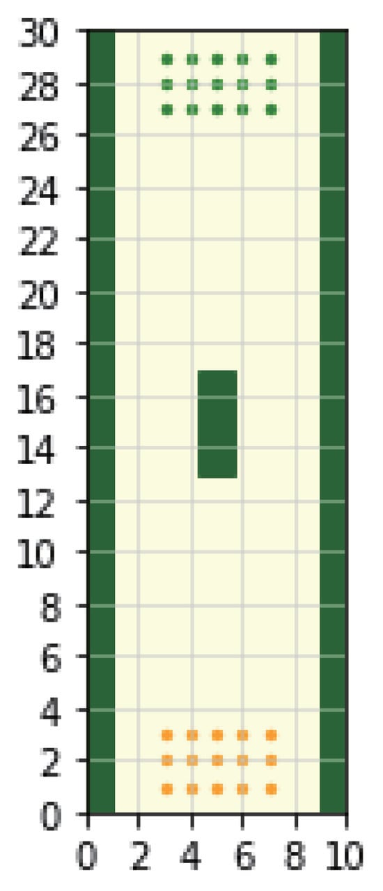 To investigate the influence of environmental design on pedestrian flow, we adopt a simulation environment in which a central obstacle is placed, as illustrated in Figure 6. This layout is motivated by urban design considerations, aiming to assess how such obstacles affect collision avoidance behavior and overall flow efficiency. The simulation runs for 800 episodes per trial, with 10 independent trials conducted for statistical validity. The first 700 episodes are used for learning, and the remaining 100 episodes are used for evaluation. We also analyze the acquired ACS2 rules to evaluate how learned behaviors contribute to crowd-level coordination and improved flow.