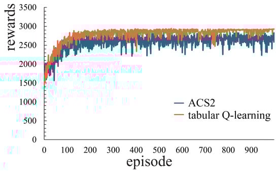 From Figure 5, we observe that both the ACS2 and tabular Q-learning achieve similar levels of average episode reward over training iterations, indicating no significant difference in overall performance. However, their internal policy representations differ substantially in terms of structural compactness and interpretability. In the ACS2 model, knowledge is encoded as a set of condition–action–effect rules, which can generalize across similar perceptual inputs. As a result, the final rule population typically contains fewer than 500 unique rules, even after extended training. In contrast, tabular Q-learning stores a value for each discretized state–action pair, leading to a significantly larger table. Given the 18-bit state encoding and seven possible actions, the full Q-table contains over 180,000 entries, most of which remain unused or sparsely updated due to the combinatorial explosion of the state space. Although our experimental setup allowed a maximum of 300,000 rules for both the ACS2 and Q-learning, most experiments reached this upper bound. However, we did not record specific quantitative data on the number or simplicity of generated rules during experiments, which represents a limitation in quantifying interpretability. Nonetheless, the modular nature of ACS2 rules still qualitatively enhances human interpretability compared to Q-learning’s large numerical tables.