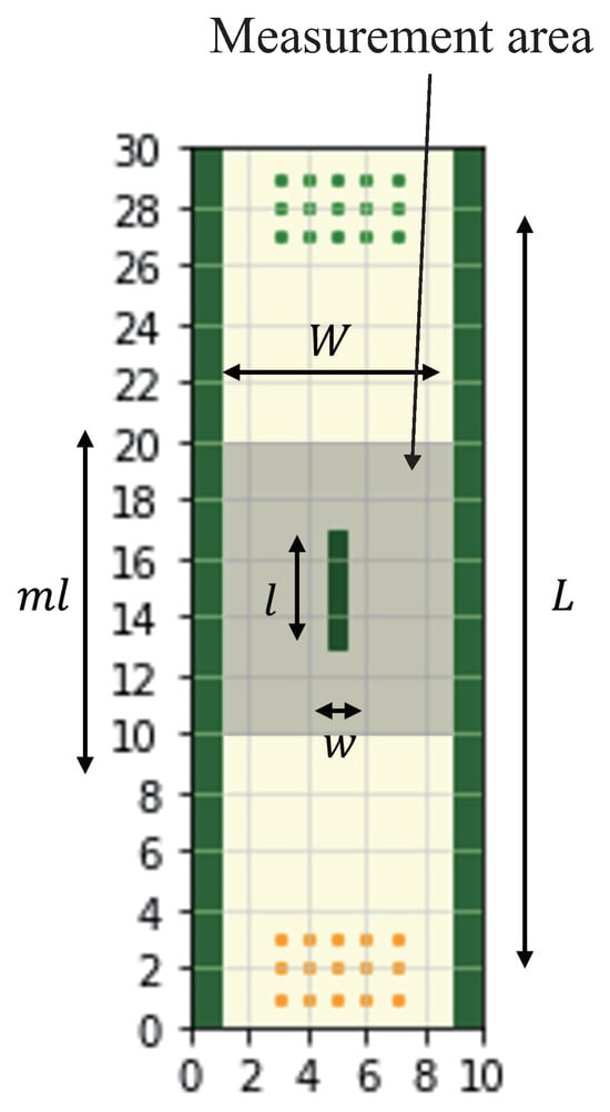 The simulation environment, illustrated in Figure 2, models a corridor with a fixed width of 3 m and a variable agent inflow rate. The bottleneck is represented by a narrowed passage 1 m wide, located at the corridor exit. Agents are generated at the entrance with randomized arrival intervals following a Poisson distribution, replicating inflow variability. Each agent is assigned a random destination at the far end of the corridor, and its behavior is governed by ACS2-learned rules. The simulation runs for 300 time steps per episode, and results are averaged over 20 episodes to ensure statistical robustness. Evaluation metrics include the density–velocity relationship, the number of agents passing through the bottleneck per unit time, and the spatial distribution of congestion.