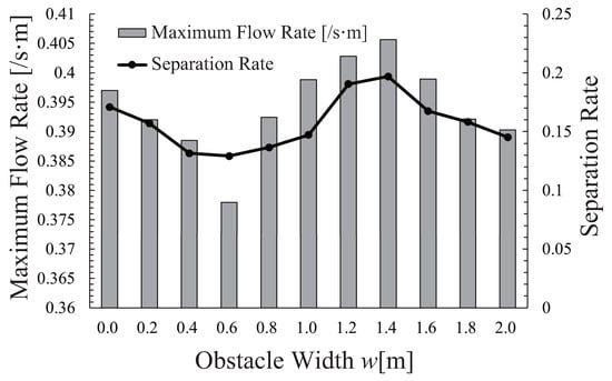 Maximum flow rate and left–right separation rate as a function of obstacle width.