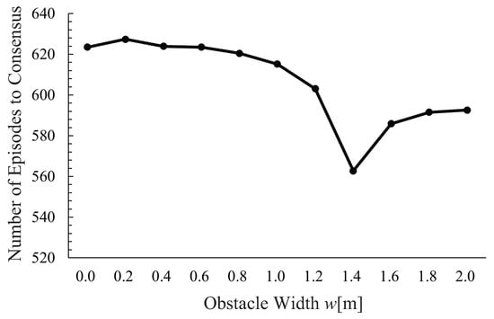 Number of episodes required to achieve consensus formation at varying obstacle widths.