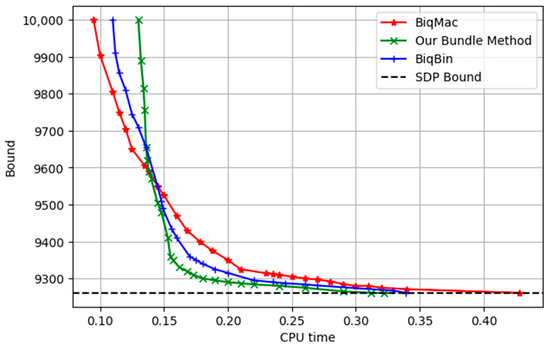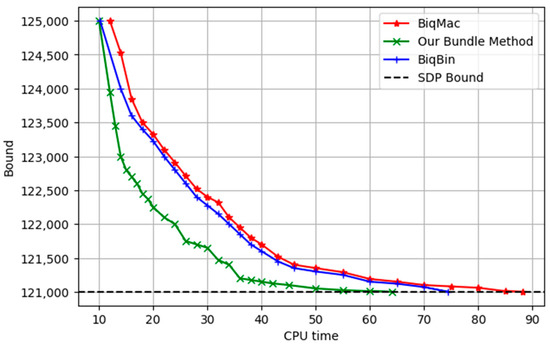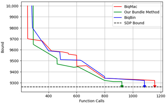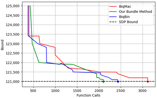 To illustrate the effectiveness of our approach, we examined the instance bqp500-1, which contains 500 nodes. Figure 3 presents a plot of the CPU time against the bound, with the semidefinite programming (SDP) bound at 121,001. Figure 4 presents a plot of the number of function calls against the bound. From Figure 1 and Figure 2, we observed that the proposed bundle method required 64.0592 s of CPU time to achieve the SDP bound, whereas BiqBin and BiqMac required 74.4438 s and 88.2436 s, respectively. Additionally, our method demonstrated a superior efficiency, requiring only 2102 function calls to reach the SDP bound, while BiqBin and BiqMac required 2435 and 3119 function calls, respectively.