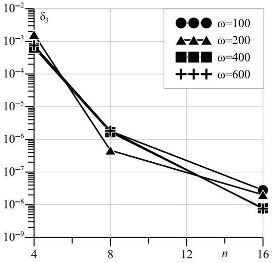 Figure 1 displays the computed relative errors for various values of and truncation orders n corresponding to the results in Table 3. The figure clearly demonstrates the exponential convergence of the proposed method: the relative error decreases rapidly with increasing n. This behavior confirms the high accuracy and numerical stability of the spectral Galerkin–Levin quadrature, even for integrals with nonlinear phase functions.