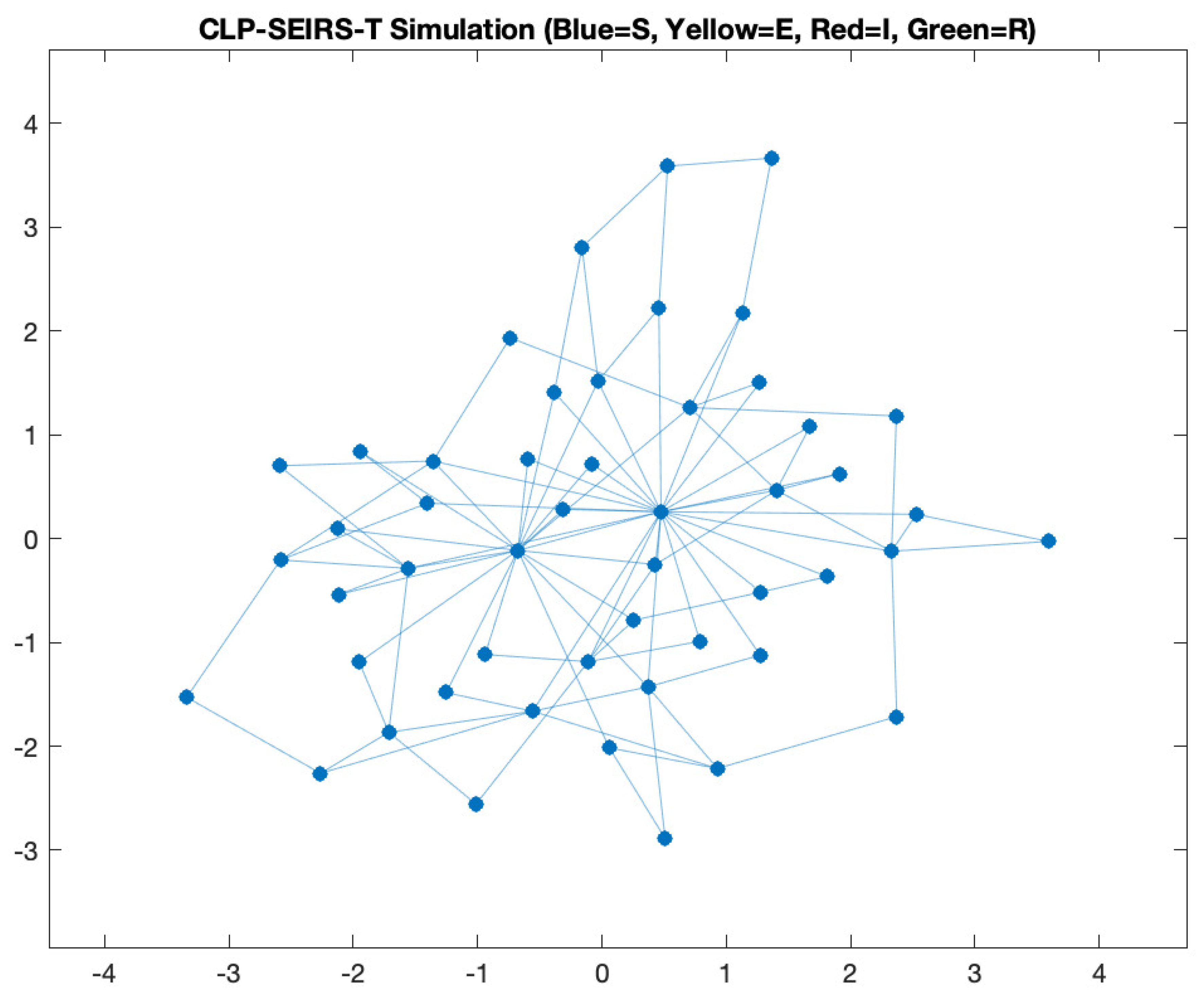 If node i or node j is offline ( or ), the term vanishes, reflecting no contact. - Exposed : increases when a susceptible node becomes infected (enters latent state), and decreases when an exposed node progresses to infectious. Any new infection of node i causes an immediate transition from to . Hence, the gain term for is exactly the loss term for derived above (since every susceptible leaving enters ). The loss term for is the progression to at rate . Thus: