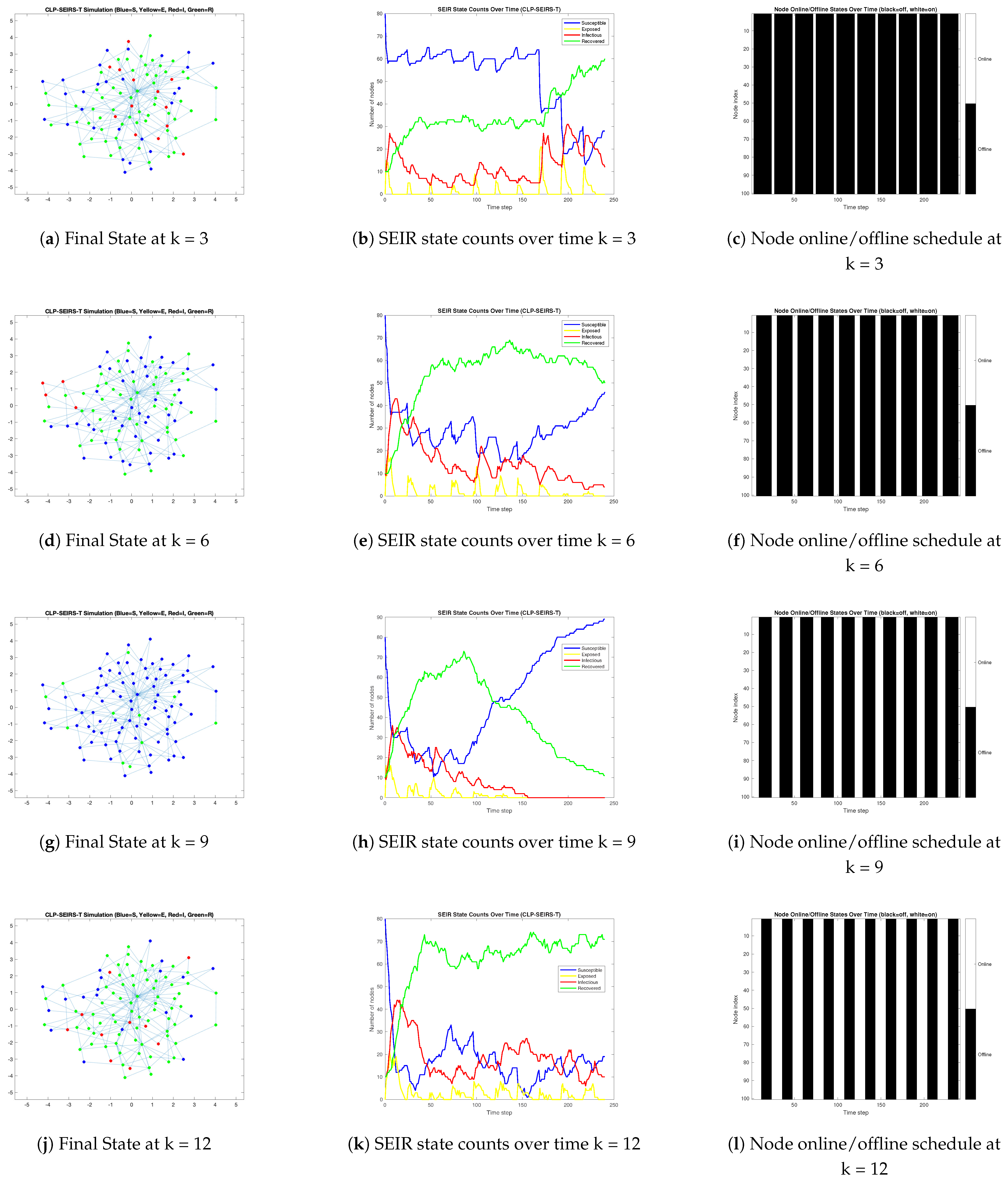 - Stochastic Node Activation: We assumed periodic, deterministic online/offline patterns for nodes to facilitate analysis. In reality, however, node activity can be stochastic. The CLP-SEIRS-T framework can be extended to incorporate random activation times or use an “activity-driven” network model. We anticipate that randomizing node activation would, on average, still mitigate malware spread similar to having a duty cycle, but the detailed temporal dynamics may differ. Future work can explore how non-periodic, probabilistic connectivity patterns affect malware propagation.